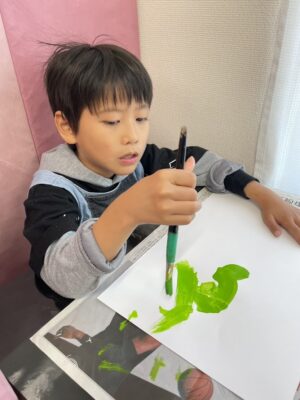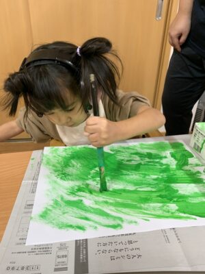まず画用紙に緑色を絵具で色塗りを行いました。