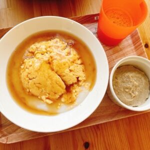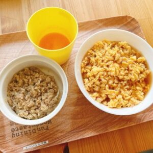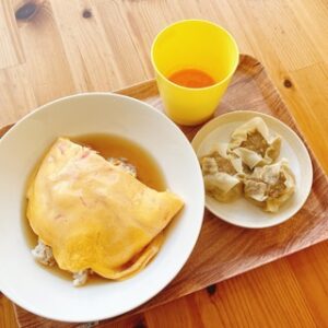 今回の献立は…天津飯と焼売とオレンジジュースです!
