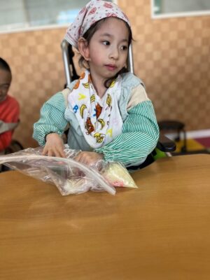 みじん切りにした玉ねぎとひき肉をジップロックに入れ、混ぜ合わせます!