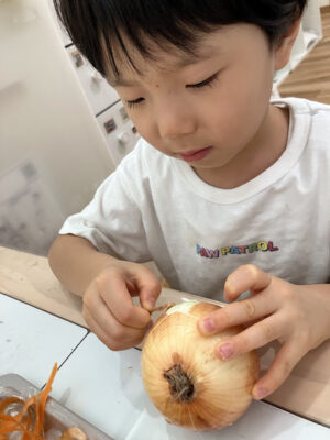 玉ねぎは手で一枚ずつ皮をむきました!
